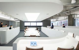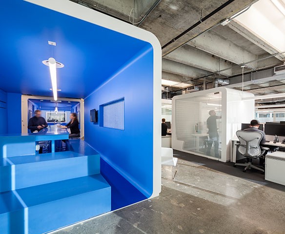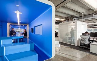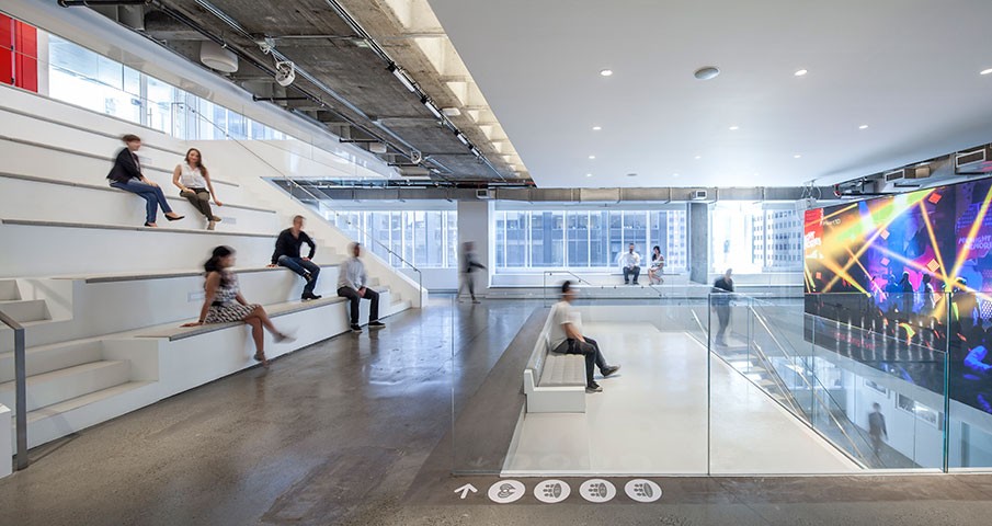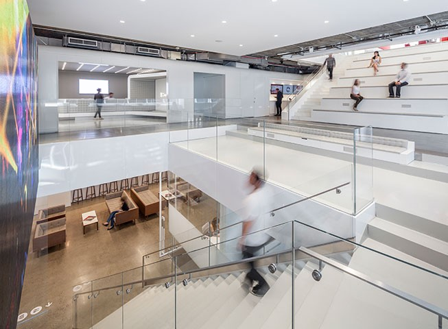 Key Accomplishments: High Tech Office Fitout, including unique gathering spaces, auditorium steps, and a light tunnel
