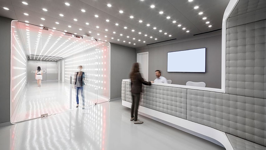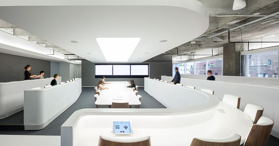 For a prominent media corporation’s NY Headquarters, EGG Electric was selected by J.T. Magen to install the lighting and power for their clever and spectacular office. Fitting out three existing floors at 125 W 55th street, the space featured a stunning array of integrated lighting installed into a mix of sculptural spatial experiences connecting the floors together. The architecture included a multi-level central auditorium with media screen, a pinlight entry hallway programmed as a sound and light experience, and striking office use pods for pantries and private meeting uses nestled in the space.